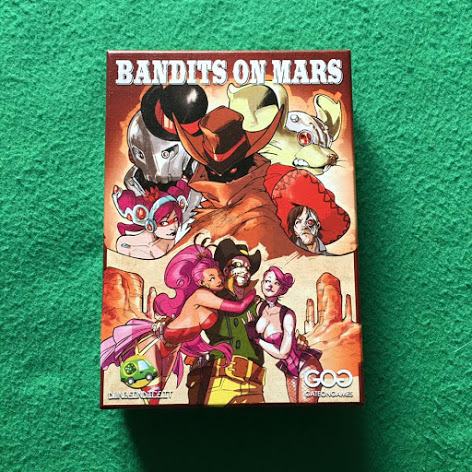 Bandits on Mars ci pone sul pianeta rosso, nel più famoso parco a tema Vecchio West , chiamato Woodburg. Qui dei cyborg-criminali hanno preso possesso della struttura, e noi giocatori ci caleremo nei panni di volenterosi e determinati cacciatori di taglie che dovranno raccogliere il maggior numero di crediti per poter vincere la partita. Ma come faremo? Bandits on Mars è un gioco card-driven, dove ad inizio partita uno dei giocatori avrà la carta The End, che segnerà la fine delle ostilità, posta in fondo al suo mazzetto personale. Dopodiché si tratterà di rivelare a turno la prima carta del proprio mazzo e di comportarsi di conseguenza; rivelando altri banditi andremo ad aumentare il pool di malviventi pronti ad essere catturati. Ma è quando si riveleranno le carte Wanted che la situazione si farà davvero calda! Eh sì, poiché i banditi sono di 5 tipi, ognuno in 3 colori differenti; la carta Wanted riporterà su di essa uno specifico tipo di ricercato, e a quel punto - SBAM! - sarà nostra cura coprire con una mano (una sola, per ora!) la carta che raffigura il giusto personaggio (indipendentemente dal colore) prima che i nostri avversari facciano lo stesso. E qui già iniziano le prime cattiverie, e saltano le prime dita. Ma la cosa divertente è che, una volta finite le eventuali catture, tutte le carte Bandito rimanenti verranno girate a faccia in giù! Quindi entra in gioco una seconda meccanica di Bandits on Mars, più "Memory" se vogliamo, dove dovremo ricordarci del colore e del tipo di bandito per poter continuare a fare punti nei turni successivi. Non è finita qui ovviamente, abbiamo altre carte! Rivelando una Rissa, possiamo acchiappare con entrambi le mani tutti i banditi del colore della rissa, e qui è il momento di chiamare il reparto di ortopedia di fiducia. Però, dita a parte, con la Rissa potremo poi girare a faccia in su tutte le carte rimanenti. Un'altra carta fondamentale è la Fuga. Chi, sempre a manate, si aggiudicherà il segnalino del Toro Razzo che sarà posizionato al centro del tavolo tra tutte le altre carte rivelate, farà fuggire i banditi catturati finora dagli avversari del colore della carta Fuga rivelata! Devastante. Ci si può salvare solo se si ha il segnalino Sceriffo, che si prende sempre con violenza quando si rivela la carta Sceriffo; ma occhio alle Ballerine, dove chi conquisterà il segnalino a forma di cuore, pur perdendo qualche falange, farà rimettere al centro del tavolo i segnalini sceriffo degli altri giocatori e, soprattutto, farà tornare in gioco i banditi che erano scappati durante la Fuga. Insomma, un grande bailamme, ma anche un gran divertimento.
